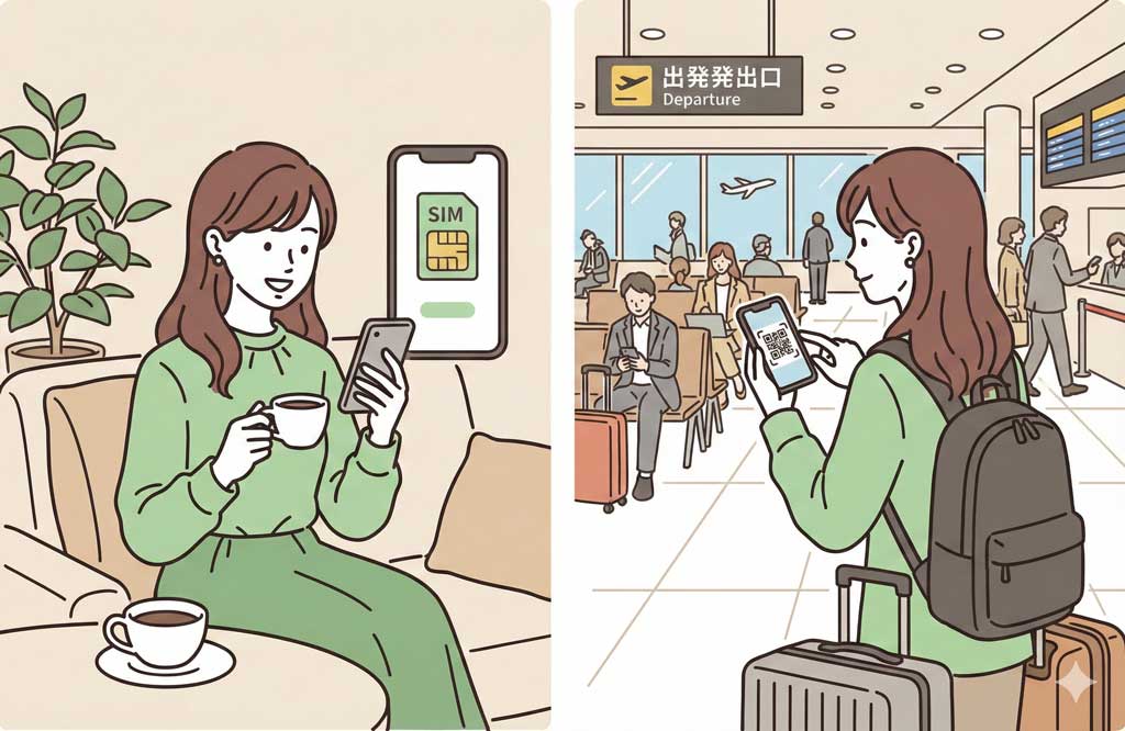 - 日本で事前に海外専用eSIM(AiraloやUbigiなど)を購入・インストール。