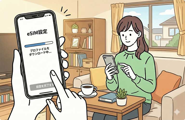 eSIMは端末に内蔵されたチップに、デジタルの契約情報(プロファイル)を書き込む仕組みです。申し込み後、メールで届くコードなどを読み込むだけで、物理的なカードの到着を待たずに開通します。